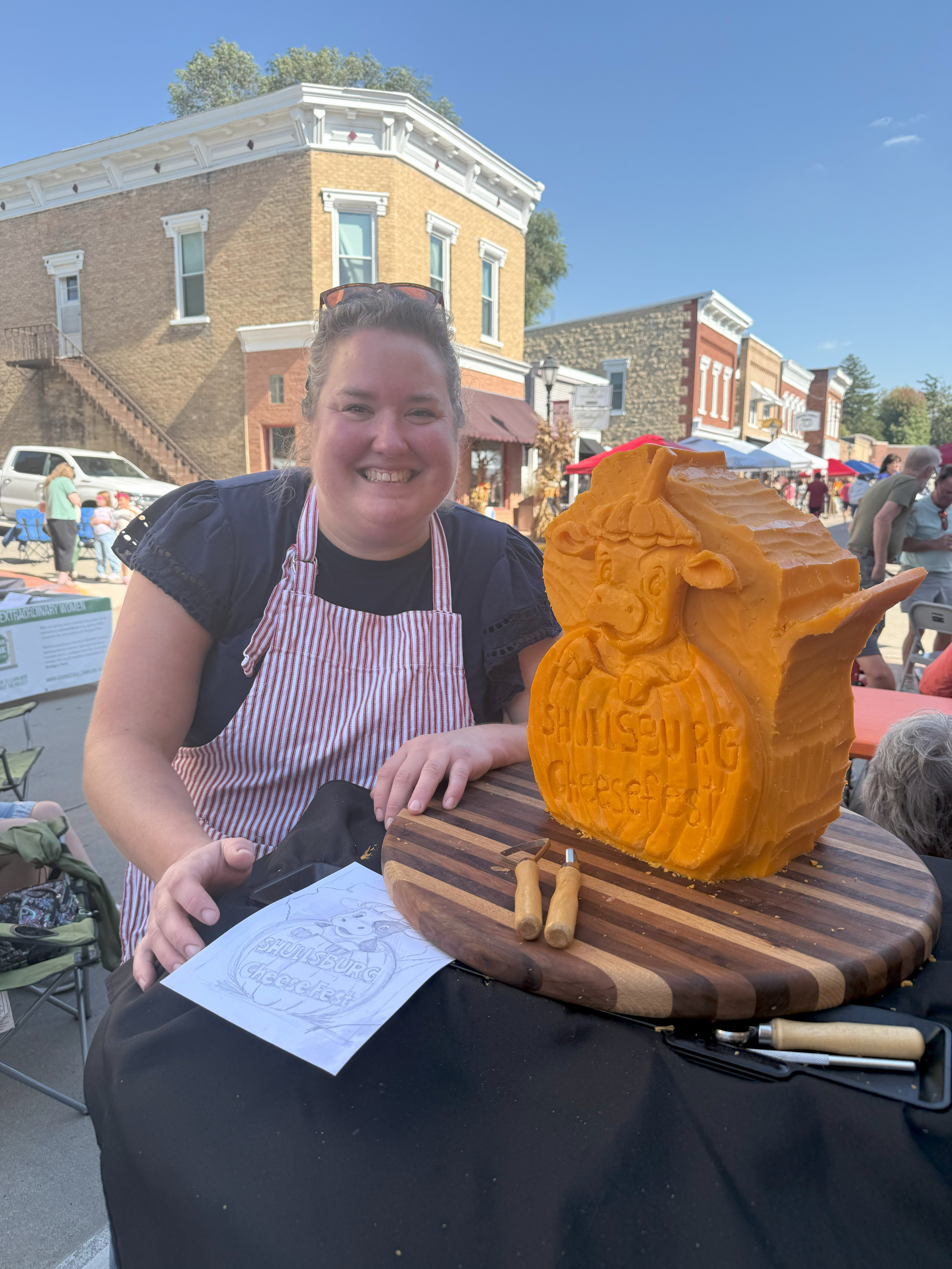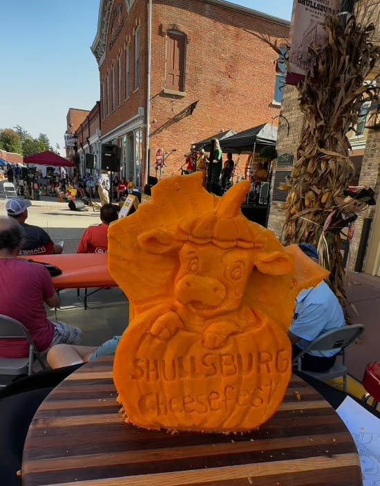 It was one beautiful day at this year's Cheesefest, taking place in historic downtown Water Street earlier this month. And one of the event's favorite attractions is always the sculpted Cheddar cow. Shullsburg Creamery proudly donates a 40-pound block of Cheddar each year to sculptor Vicki Janisch, who then does her magic. We caught up with Vicki to understand the inspiration behind this year's cow!